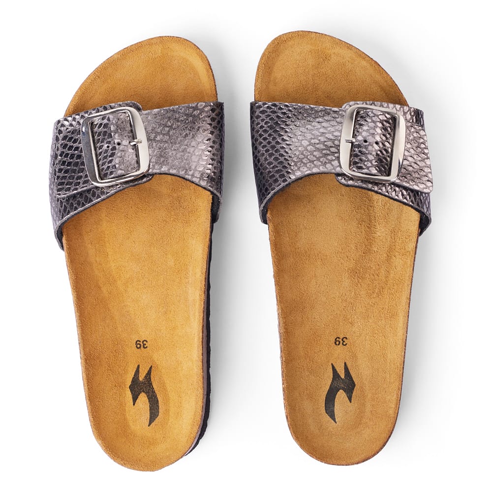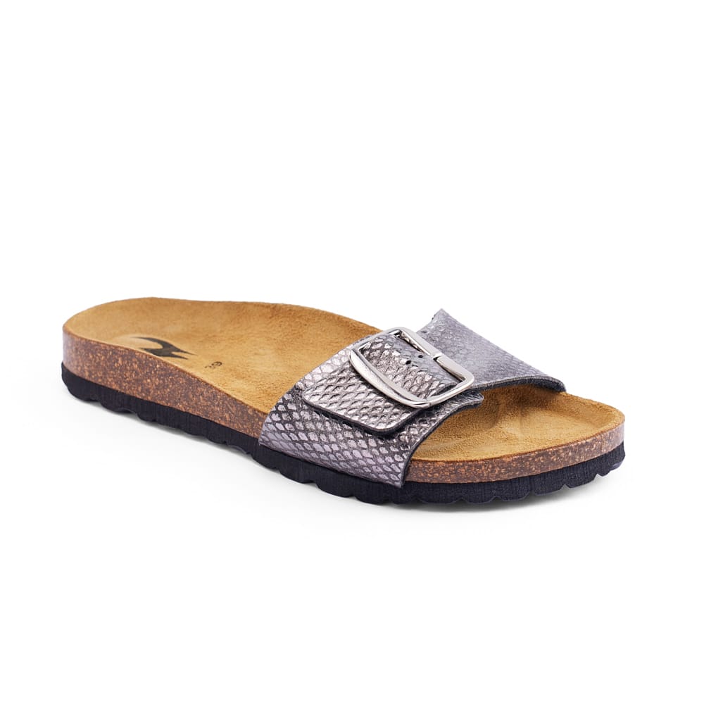 ABRAZO-PYTHON is a statement sandal designed for everyday comfort with a bold edge. Featuring premium synthetic python-textured leather and a Spanish natural cork footbed, it delivers ergonomic support while staying lightweight and easy to wear.
