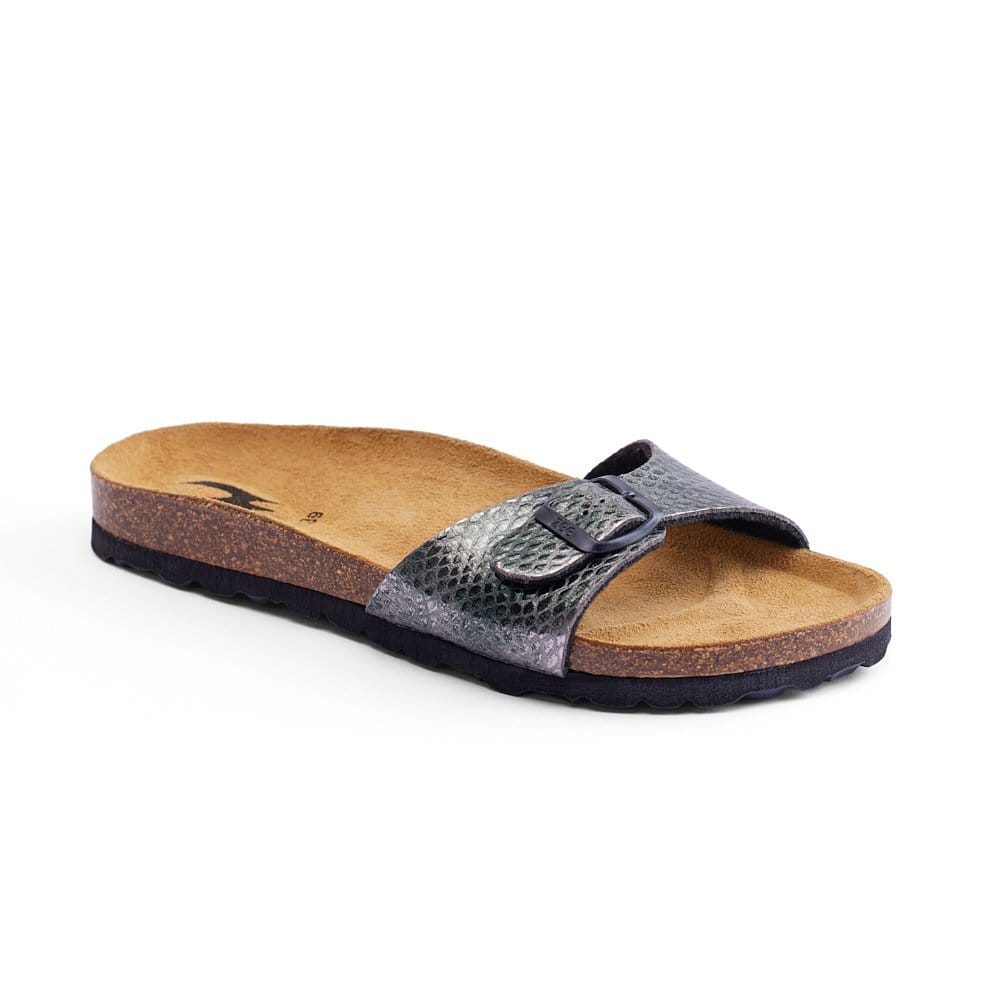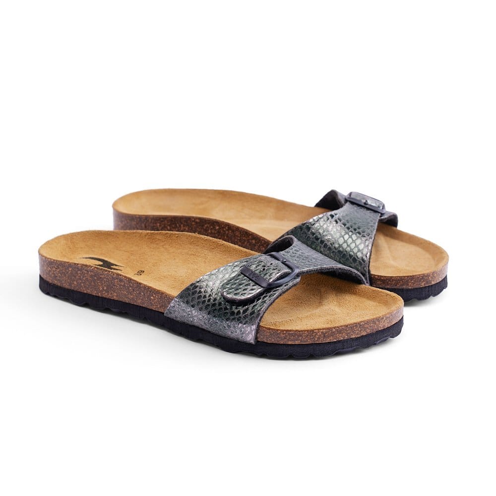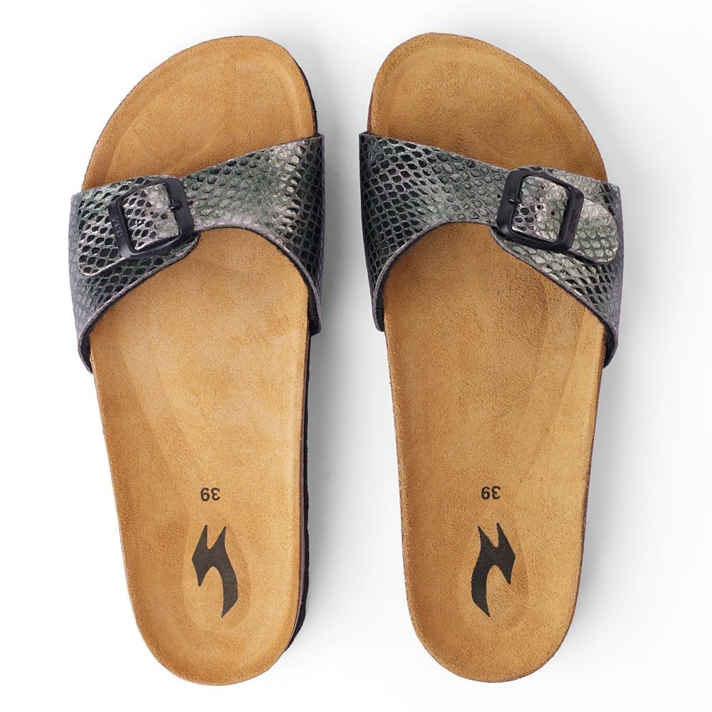 DAMA-PYTHON is a sandal designed for everyday comfort with bold texture. Built with premium synthetic leather and a Spanish cork footbed, it balances style and support.