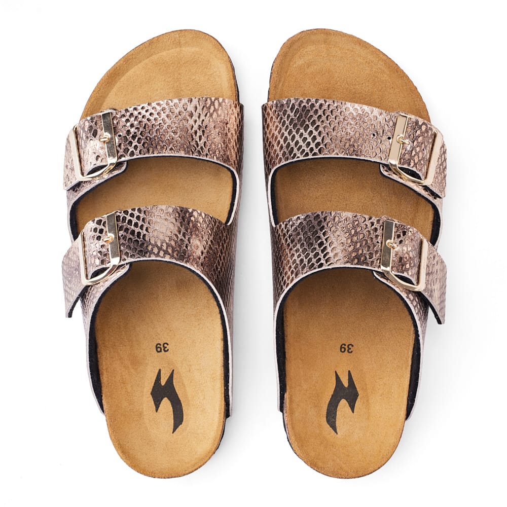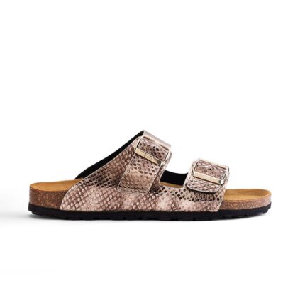 GRANDE-TODO-PYTHON is a sandal designed for everyday wear with a bold look. Built with premium python-pattern leather and a Spanish cork footbed, it provides support and comfort.